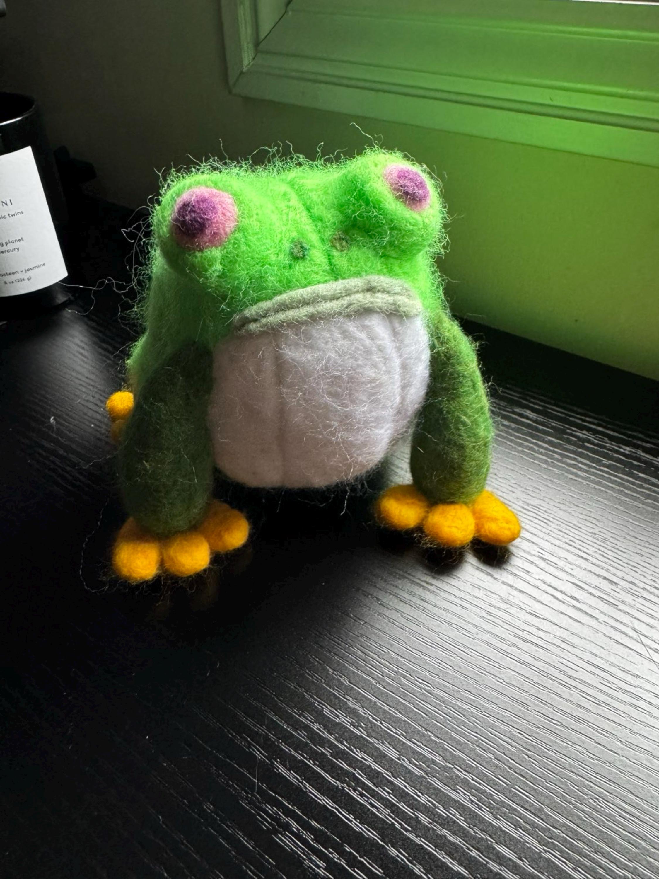 Delight in the charm (and the ever-present stare) of this handmade needle felted Frogbert plush, crafted with love for fans of Palia. Made from 100% natural wool, this soft, vibrant plush stands approximately 5 inches tall, making it an ideal decorative companion for your gaming space or office. Each stitch is meticulously felted by hand to create Frogbert's unique design. You can personalize the plush to turn his stare wherever you like.