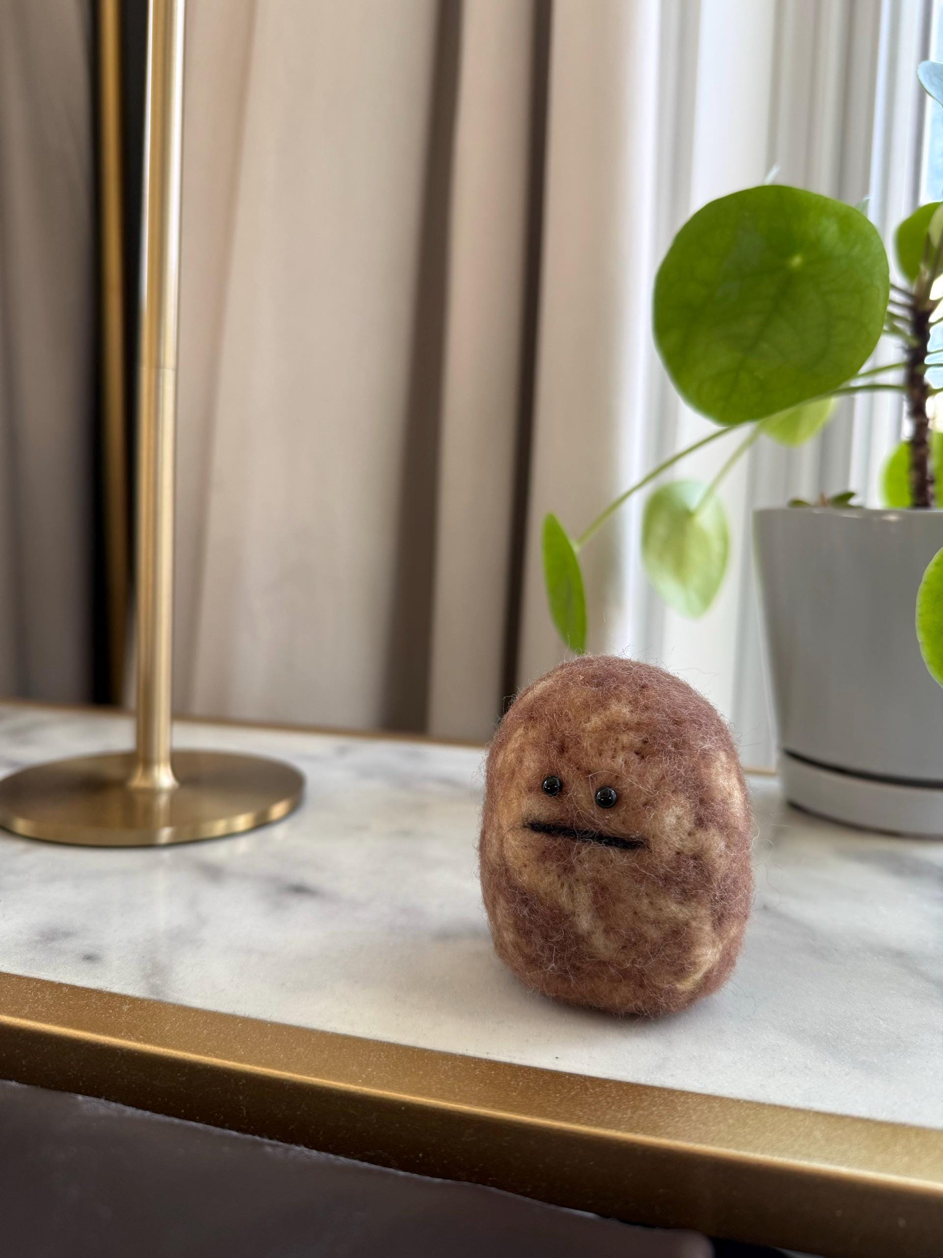 Check out our needle felted potato...I guess. This adorably nonchalant plush is crafted with care using high-quality wool. Each potato is lovingly shaped and needle felted to create the perfect blend of personality and charm—because who doesn't love a potato that reflects their mood? Measuring approximately 3 inches tall, this little guy is compact enough to rest on your desk or display on your favorite shelf.